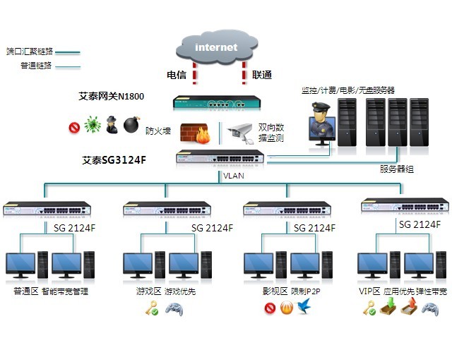 客戶選擇去網(wǎng)吧的很大一個(gè)原因就是為了體驗(yàn)高速?zèng)_浪的樂(lè)趣和游戲永不掉線,而由于P2P軟件的盛行,其對(duì)帶寬的極大占用將極大的影響其它用戶的上網(wǎng)速度。艾泰網(wǎng)關(guān)彈性帶寬控制和管理聯(lián)動(dòng)交換機(jī)有效保障視頻、網(wǎng)游等數(shù)據(jù)的傳輸,限制P2P軟件的超大流量。