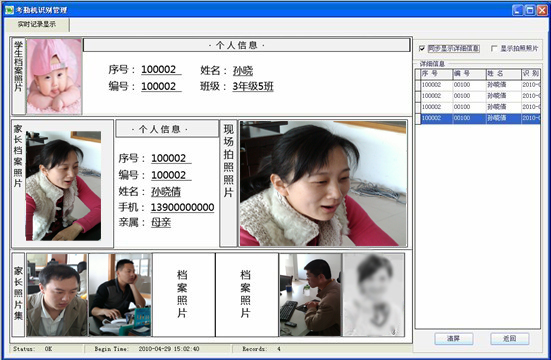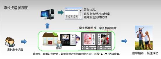 家長接送: 設(shè)備安裝于門衛(wèi)室旁,家長進(jìn)門時(shí),首先進(jìn)行刷卡,家長刷卡以后,管理員現(xiàn)場查看刷卡信息,比對照片,如與檔案照片不符(因小孩可能對應(yīng)多位家長接送),則按“↑”與“↓”鍵,查看所屬其他家長照片,查到該家長照片則完成接送。 后臺(tái)管理員可實(shí)時(shí)查看刷卡數(shù)據(jù),實(shí)現(xiàn)實(shí)時(shí)查看。