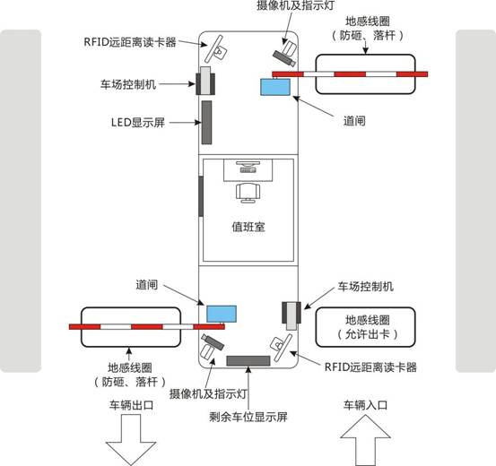 車輛入場時,司機將所持有的本車場IC/ID 卡放在入口控制機的讀卡區(qū)域前讀卡,如果讀卡有效,道閘的閘桿自動抬起,允許車輛進入,車輛通過入口處的道閘后,閘桿自動下落,封閉入口車道。