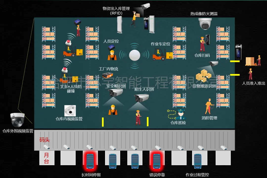 *人員進(jìn)出權(quán)限混亂,無關(guān)人員隨意出入,事后追溯無據(jù)可依; *叉車與人員、叉車與叉車碰撞事件頻發(fā),安全管控缺乏有效手段; *作業(yè)人員效率全憑經(jīng)驗(yàn)判斷,工時(shí)測(cè)算無數(shù)據(jù)支撐,人員配置不合理; *物資出入庫依賴紙質(zhì)單據(jù),盤點(diǎn)耗時(shí)耗力,易出現(xiàn)賬實(shí)不符; *重要物資存儲(chǔ)區(qū)域缺乏專項(xiàng)監(jiān)管,防火、防盜、防損耗措施不足。 【科技賦能,全鏈管控】: 安全是倉庫管理的核心,通過多重技術(shù)手段,實(shí)現(xiàn)全方位無死角防護(hù): 人員準(zhǔn)入精準(zhǔn)管控:采用人臉鑒權(quán)聯(lián)動(dòng)門禁系統(tǒng),只有授權(quán)人員可刷臉進(jìn)出倉庫,陌生人靠近重要區(qū)域時(shí),系統(tǒng)實(shí)時(shí)報(bào)警并推送提醒給管理員,事后可快速追溯人員進(jìn)出記錄; 人車安全防撞預(yù)警:在叉車、作業(yè)人員身上部署 UWB 定位設(shè)備,當(dāng)叉車與人員、叉車與叉車距離小于安全閾值時(shí),系統(tǒng)立即發(fā)出語音預(yù)警,提醒司機(jī)減速規(guī)避,大幅降低碰撞風(fēng)險(xiǎn); 重點(diǎn)區(qū)域防火監(jiān)測(cè):在物資密集區(qū)、易燃品存儲(chǔ)區(qū)部署熱成像相機(jī),7×24 小時(shí)實(shí)時(shí)監(jiān)測(cè)溫度變化,一旦出現(xiàn)溫度異;蚧瘘c(diǎn),立即觸發(fā)報(bào)警并聯(lián)動(dòng)處置,做到防患于未然; 作業(yè)規(guī)范智能監(jiān)管:通過 AI 相機(jī)自動(dòng)識(shí)別人員安全帽佩戴情況,未佩戴時(shí)現(xiàn)場(chǎng)語音提醒并后臺(tái)記錄,同時(shí)對(duì)貨物堆積占用通道、車輛錯(cuò)誤?康冗`規(guī)行為實(shí)時(shí)監(jiān)測(cè),保障作業(yè)環(huán)境規(guī)范有序。 以數(shù)字化手段優(yōu)化作業(yè)流程,減少人工干預(yù),提升整體運(yùn)營效率: 人車定位與效率分析:通過 UWB 定位技術(shù),實(shí)時(shí)追蹤作業(yè)人員和叉車的位置,自動(dòng)統(tǒng)計(jì)人員作業(yè)時(shí)長、休息時(shí)長、脫崗情況,為標(biāo)準(zhǔn)工時(shí)測(cè)算和人員配置提供數(shù)據(jù)支撐;同時(shí)分析叉車作業(yè)軌跡和庫區(qū)停留時(shí)間,優(yōu)化作業(yè)路線,提升物流周轉(zhuǎn)效率; 物資管理智能化:采用 RFID 射頻識(shí)別 + 掃碼 PDA 雙模式,實(shí)現(xiàn)物資出入庫自動(dòng)識(shí)別、信息實(shí)時(shí)上傳,告別紙質(zhì)單據(jù)繁瑣流程;定期盤點(diǎn)時(shí),通過手持設(shè)備快速核對(duì)物資信息,確保賬卡物相符,盤點(diǎn)效率提升 80%; 內(nèi)物流自動(dòng)化升級(jí):引入智能 AGV 機(jī)器人,實(shí)現(xiàn)原材料、半成品、成品的自動(dòng)搬運(yùn)、出入庫和存儲(chǔ),構(gòu)建 “貨到人的高效作業(yè)模式”,減少揀貨、補(bǔ)貨人工投入,同時(shí)避免人為操作失誤,提升物流流轉(zhuǎn)穩(wěn)定性; 數(shù)字化月臺(tái)管理:通過智能相機(jī)識(shí)別車牌、車輛?繝顟B(tài)、裝載進(jìn)度,結(jié)合顯示屏和語音播報(bào),實(shí)現(xiàn)車輛叫號(hào)、?砍瑫r(shí)提醒、作業(yè)人數(shù)統(tǒng)計(jì)等功能,讓月臺(tái)調(diào)度有序高效,減少車輛等待時(shí)間。 【一體化管理平臺(tái)】: 360° 全景監(jiān)控覆蓋:監(jiān)控覆蓋倉庫內(nèi)外,結(jié)合 AR 技術(shù)疊加點(diǎn)位標(biāo)簽和數(shù)據(jù)信息,全局態(tài)勢(shì)一目了然; 平臺(tái)整合:整合安全報(bào)警、作業(yè)數(shù)據(jù)、物資流轉(zhuǎn)、設(shè)備狀態(tài)等核心信息,實(shí)時(shí)展示倉庫運(yùn)營動(dòng)態(tài),支持?jǐn)?shù)據(jù)統(tǒng)計(jì)分析和報(bào)表導(dǎo)出; 支持移動(dòng)端遠(yuǎn)程管控:管理員隨時(shí)隨地接收?qǐng)?bào)警提醒、查看倉庫狀態(tài)、審批相關(guān)流程,實(shí)現(xiàn) “無人值守,有人監(jiān)管”; 安消一體聯(lián)動(dòng):將消防火災(zāi)報(bào)警、可燃?xì)怏w泄漏、用電安全監(jiān)測(cè)等數(shù)據(jù)與安防系統(tǒng)融合,出現(xiàn)異常時(shí)自動(dòng)觸發(fā)應(yīng)急預(yù)案,聯(lián)動(dòng)視頻復(fù)核、人員通知,最大化降低損失。