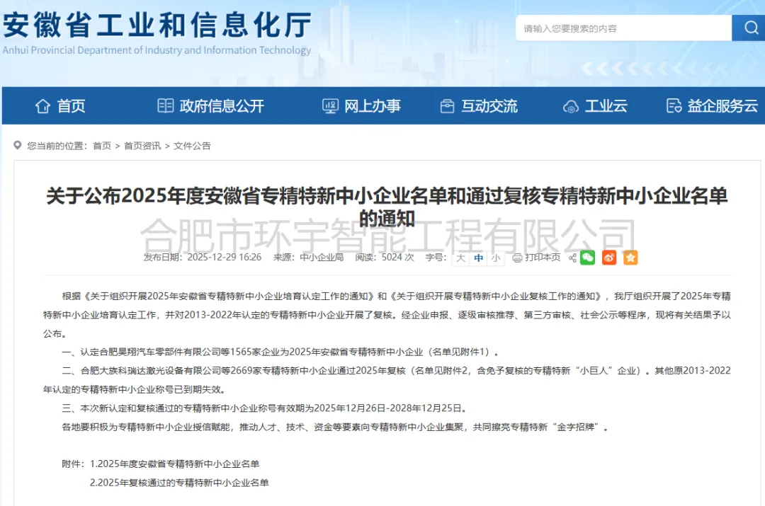 近日,安徽省工業(yè)和信息化廳正式公布了《2025年度安徽省專精特新中小企業(yè)名單》,經(jīng)過企業(yè)申報、逐級審核、第三方評審、社會公示等嚴格程序,合肥市環(huán)宇智能工程有限公司憑借在智能化工程領(lǐng)域的技術(shù)創(chuàng)新、專業(yè)服務(wù)與精細化管理,成功入選2025年安徽省“專精特新”中小企業(yè)名錄,標志著公司在專業(yè)化、精細化、特色化、創(chuàng)新能力等方面獲得了省級權(quán)威認可。