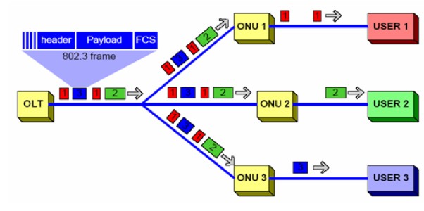 下行的數(shù)據(jù)流采用廣播方式,OLT將802.3格式的以太網(wǎng)幀數(shù)據(jù)流通過單播復(fù)制的方式推送到所有的ONU處;ONU通過判斷以太網(wǎng)幀幀頭里的由OLT分配的LLID(Logical Link ID)來判斷是否接收,接收屬于自己的數(shù)據(jù)幀,將不屬于自己的數(shù)據(jù)幀丟棄。如圖1所示。