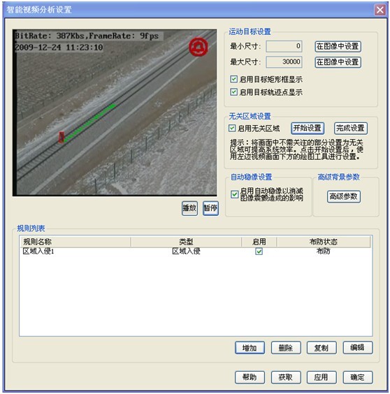 同時(shí),鐵路上防止人或動物在鐵軌區(qū)逗留,要求必須能具備智能分析的越界、進(jìn)入及徘徊功能的檢測。