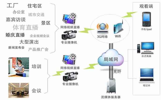 手機(jī)視頻直播系統(tǒng)是無線網(wǎng)絡(luò)技術(shù)應(yīng)用多的領(lǐng)域之一。手機(jī)視頻直播系統(tǒng)主要用于對(duì)重要區(qū)域或遠(yuǎn)程地點(diǎn)的監(jiān)督和控制(如工廠、辦公室、住宅區(qū)、景區(qū)、城市交通、體育直播、婚慶直播、企業(yè)視頻會(huì)議、新聞發(fā)布會(huì)、產(chǎn)品推廣會(huì)、大型演出、嘉賓訪談等),視頻直播系統(tǒng)將被監(jiān)控點(diǎn)實(shí)時(shí)采集的視頻文件及時(shí)地傳輸給監(jiān)控中央,實(shí)時(shí)動(dòng)態(tài)地講演被監(jiān)測(cè)點(diǎn)的情況,及時(shí)發(fā)現(xiàn)問題并進(jìn)行處理。