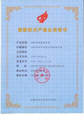 我公司研發(fā)的“網(wǎng)絡(luò)視頻監(jiān)控系統(tǒng)-智能分析”軟件獲得2013年高新技術(shù)產(chǎn)品稱號(hào)。
