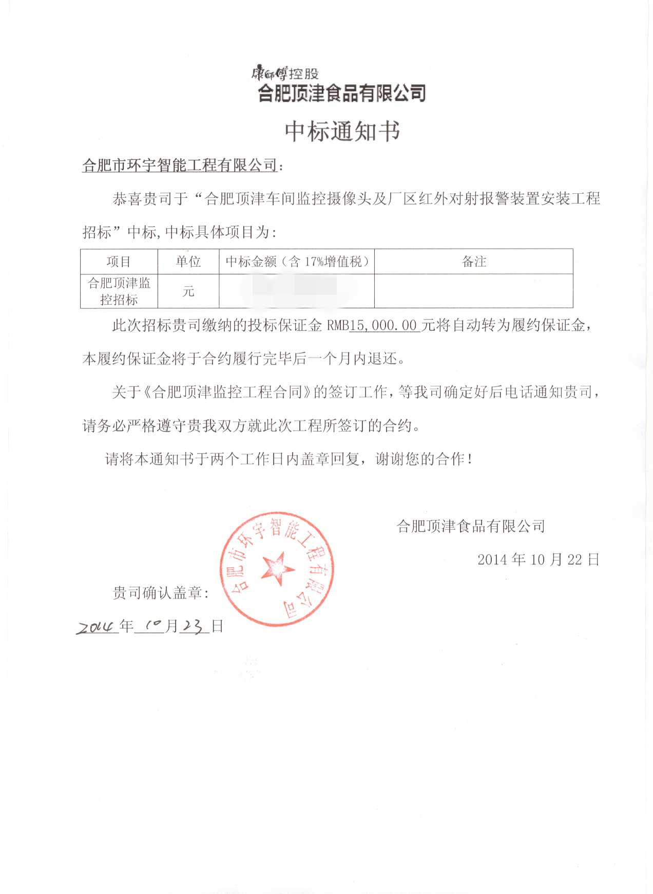 日前公司市場部傳來喜訊:合肥頂津食品有限公司通過組織專家評審后,終確認(rèn)合肥市環(huán)宇智能工程有限公司中標(biāo)該公司車間監(jiān)控攝像頭及廠區(qū)紅外對射報警裝置安裝工程。